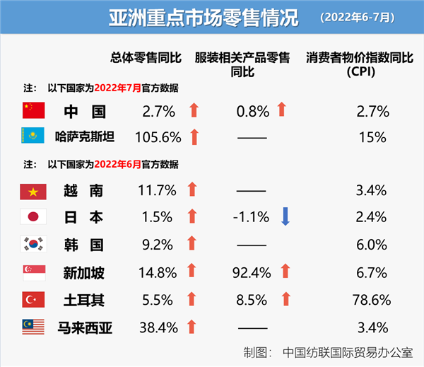 受俄乌战争和相关制裁导致的全球食品和燃料价格上涨影响,6至7月,亚洲多个国家通胀压力加剧,服装类产品零售增速放缓。