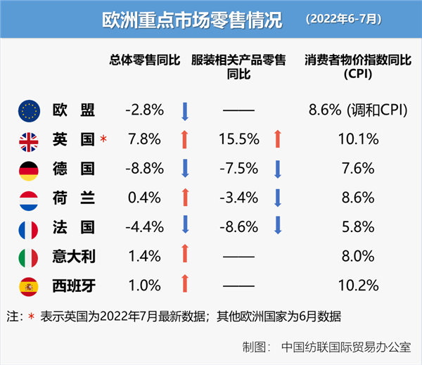今年6月,欧盟27国零售总额同比下滑2.8%,自去年2月以来首次出现负增长。能源价格高企积压下,欧洲纺织品服装类产品消费持续低迷,多个重点国家服装零售增速由正转负。