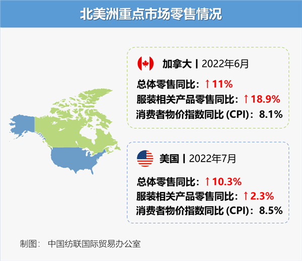 6月,加拿大通胀加速升温,CPI同比增长8.1%。同月,加拿大零售总额同比增加11%;服装类用品销售额为26.1亿加元(约20.1亿美元),去年低基数效应下同比增长18.9%,环比增长3.8%。