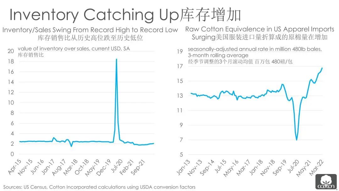 与此同时,棉花市场的需求端面临着多重问题。傅培花提到,通货膨胀是其中的一个核心问题。随着能源、食品和房产等生活必需品价格大幅上涨,消费者对于服装和家用纺织品等可支配性商品的需求将会减少,服装支出可能出现回落,这会导致零售商库存增加,订单减少,下游棉花需求面临风险。