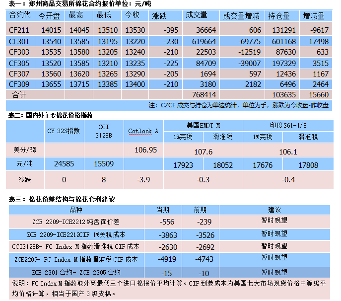 9月28日收盘,郑棉2301-2305合约价差为-15元/吨,价差较上一交易日下跌5元/吨。
