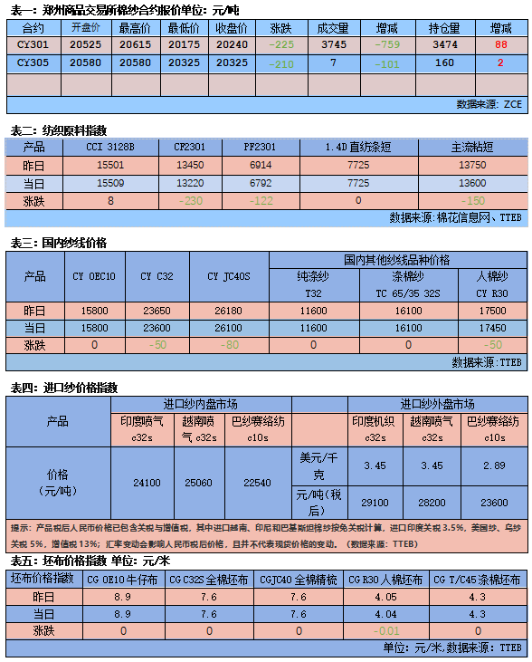 坯布市场交投变化不大,局部反应近期订单仍然弱势,主要是常规品种交投走弱,后续订单略显乏力。临近国庆,江苏家纺织厂准备放假,放假时间在3-5天;其余地区也有放假计划。棉纱市场继续走弱,期货持续大跌,市场心态谨慎,棉纱市场报价继续下调,价格压力逐渐增大,预计短期行情依旧偏弱主导。建议近期纱厂出货去库为主,投资者继续关注盘面反弹受阻的做空机会。