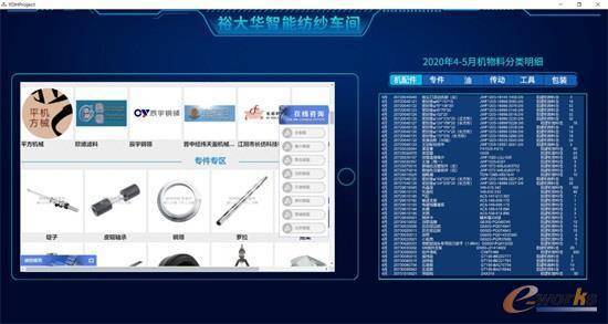 页面左侧是经纬纺机专备件网上商城,可进行专备件的实际购买,页面右侧展示近期机配件、专件、油、传动、工具、包装等常用物料的库存、消耗、采购明细。该板块除了能完成与ERP机物料采购数据的对接之外,还能通过外部链接与网上商城互动,做到供销一体化。