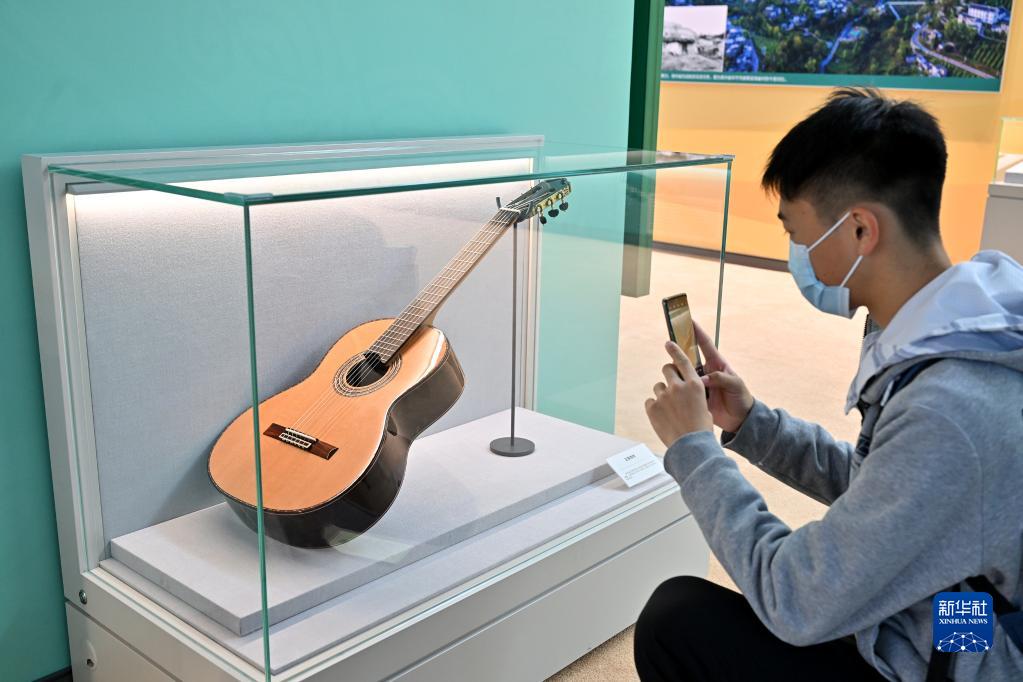 10月8日,一名观众在贵州展区拍摄正安吉他。贵州省正安县目前已成为全球最大吉他生产基地,已带动近15000人在家门口就业、6000余人稳定脱贫。新华社记者 李鑫 摄