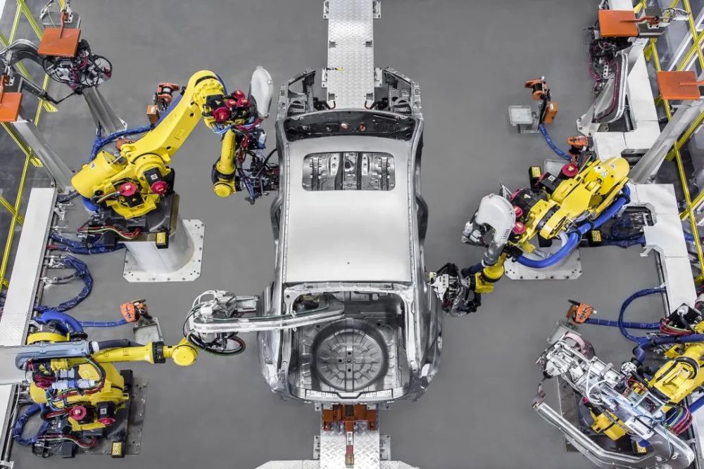 ▲高效通用机器人4平台同时运作,实现多车型70%主拼工位焊点焊接,大大降低生产时间及人工成本